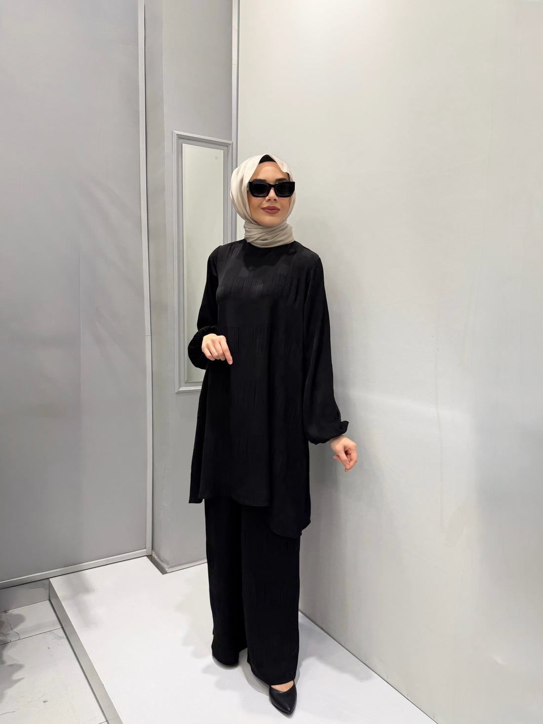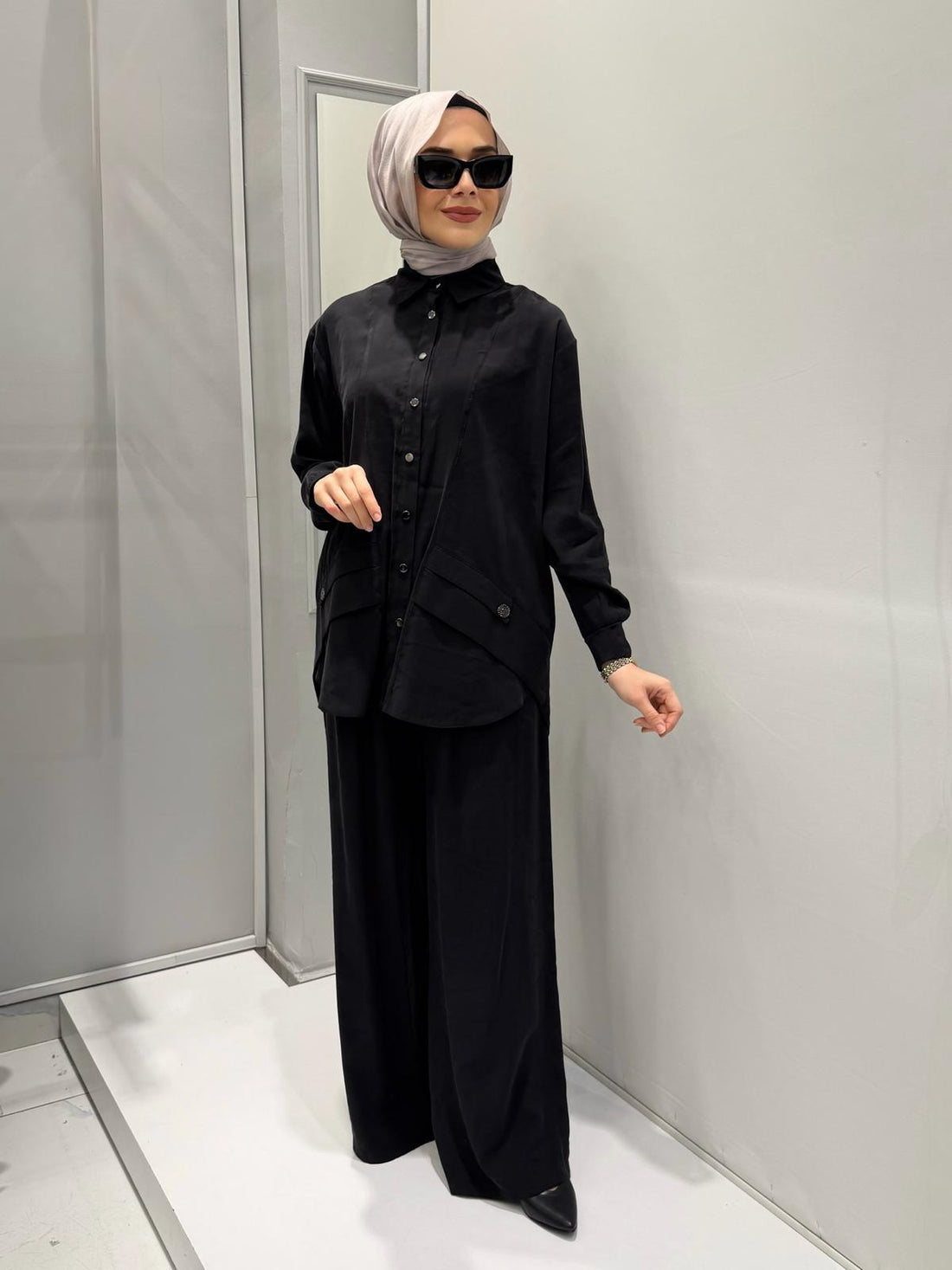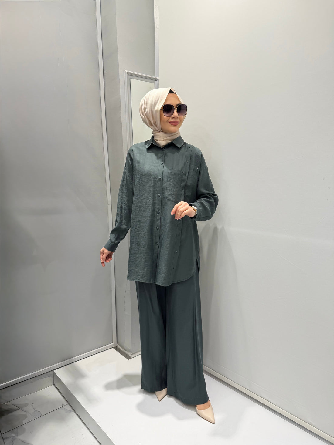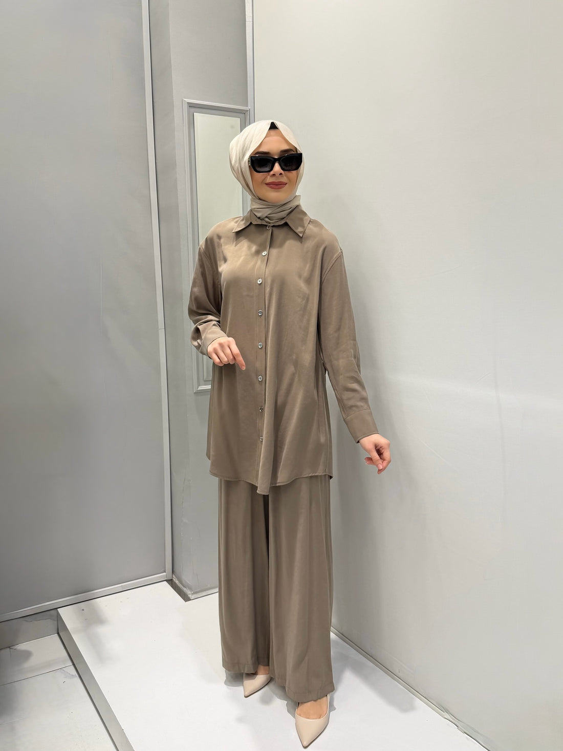 Sandy ve şifon detaylı pantolonlu takım