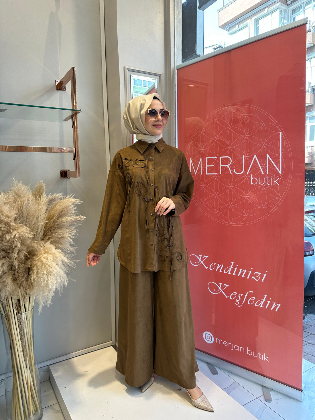 ÜRÜN ÖZELLİKLERİ* Iki parçalı takım (üst gömlek + geniş paça pantolon)* Üst parça: Düğmeli, yakalı,...