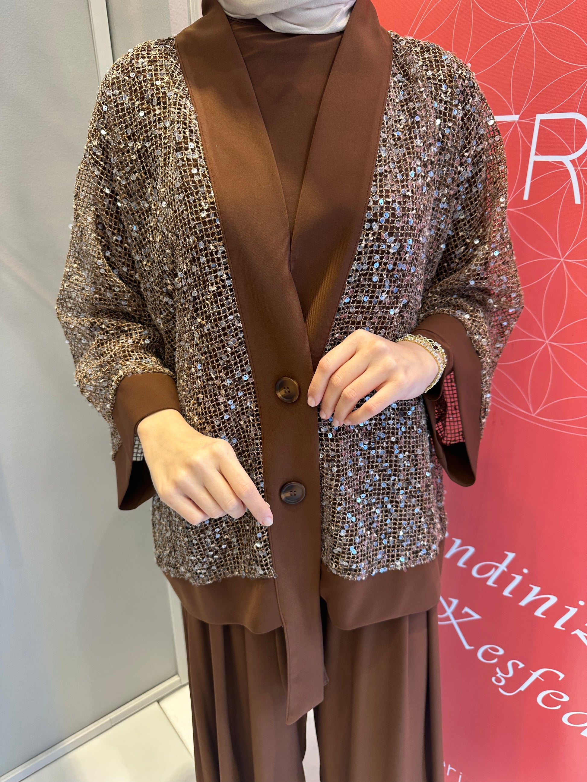 * Kumaş: Işıltılı payet detaylı şık kumaş (üst), dökümlü ve akıcı kumaş (pantolon)