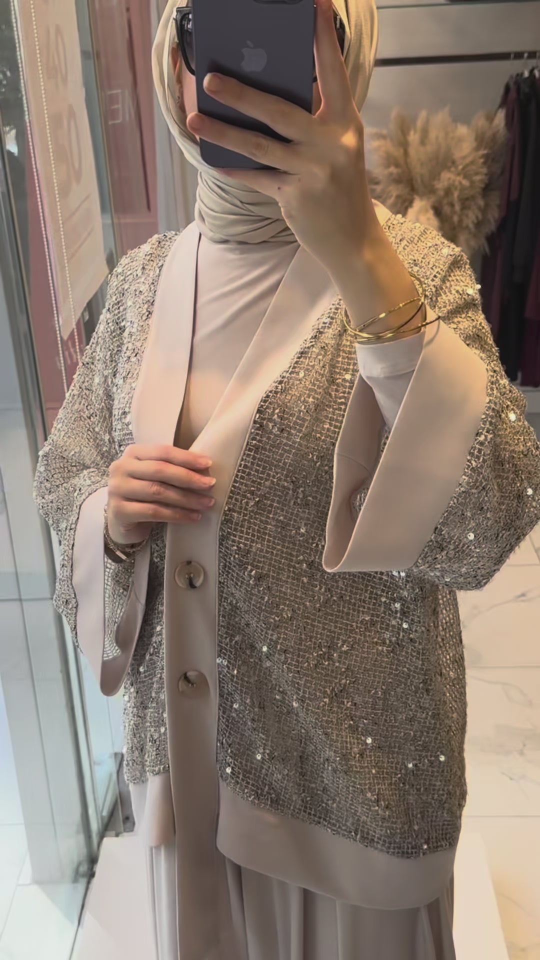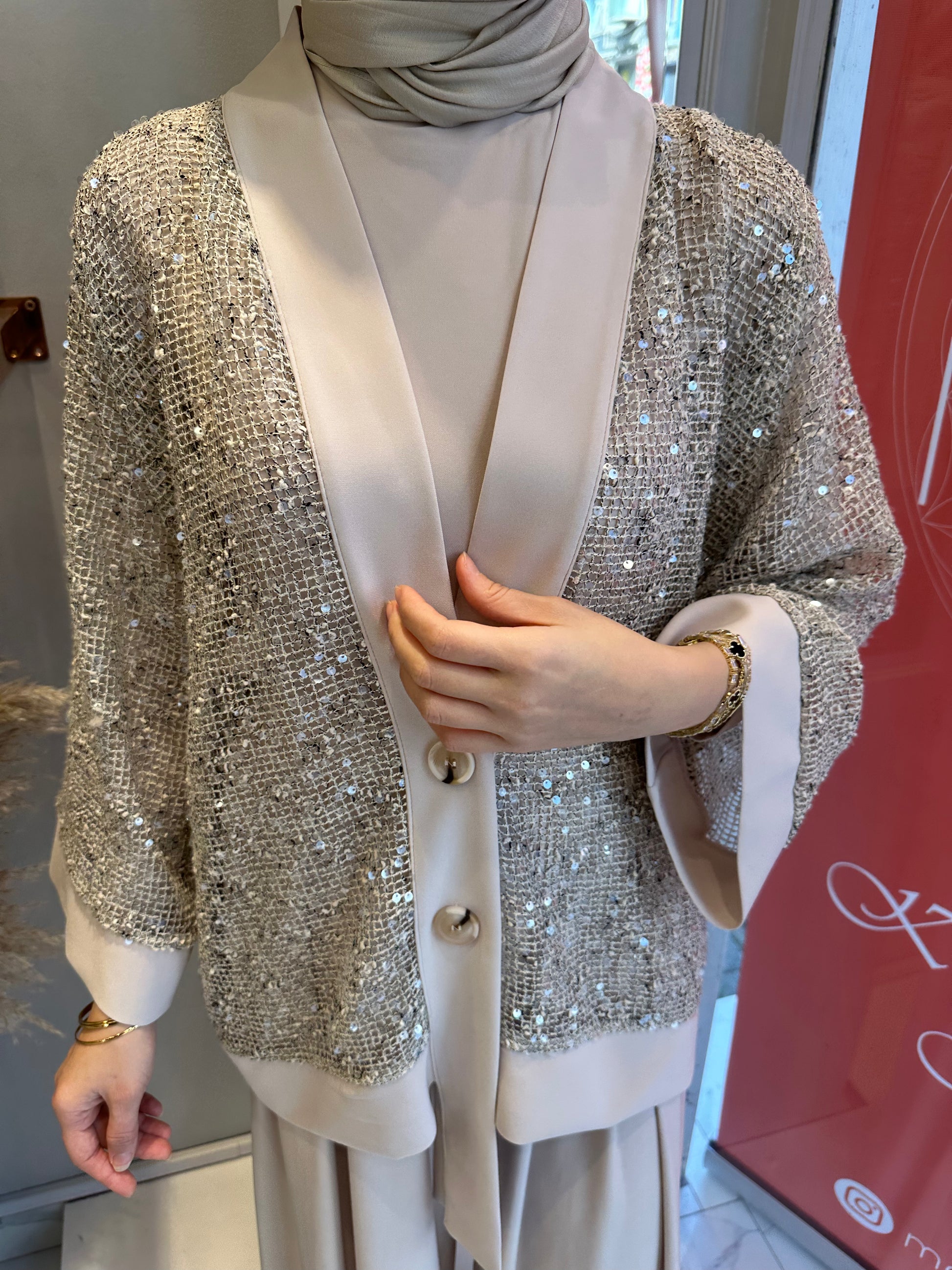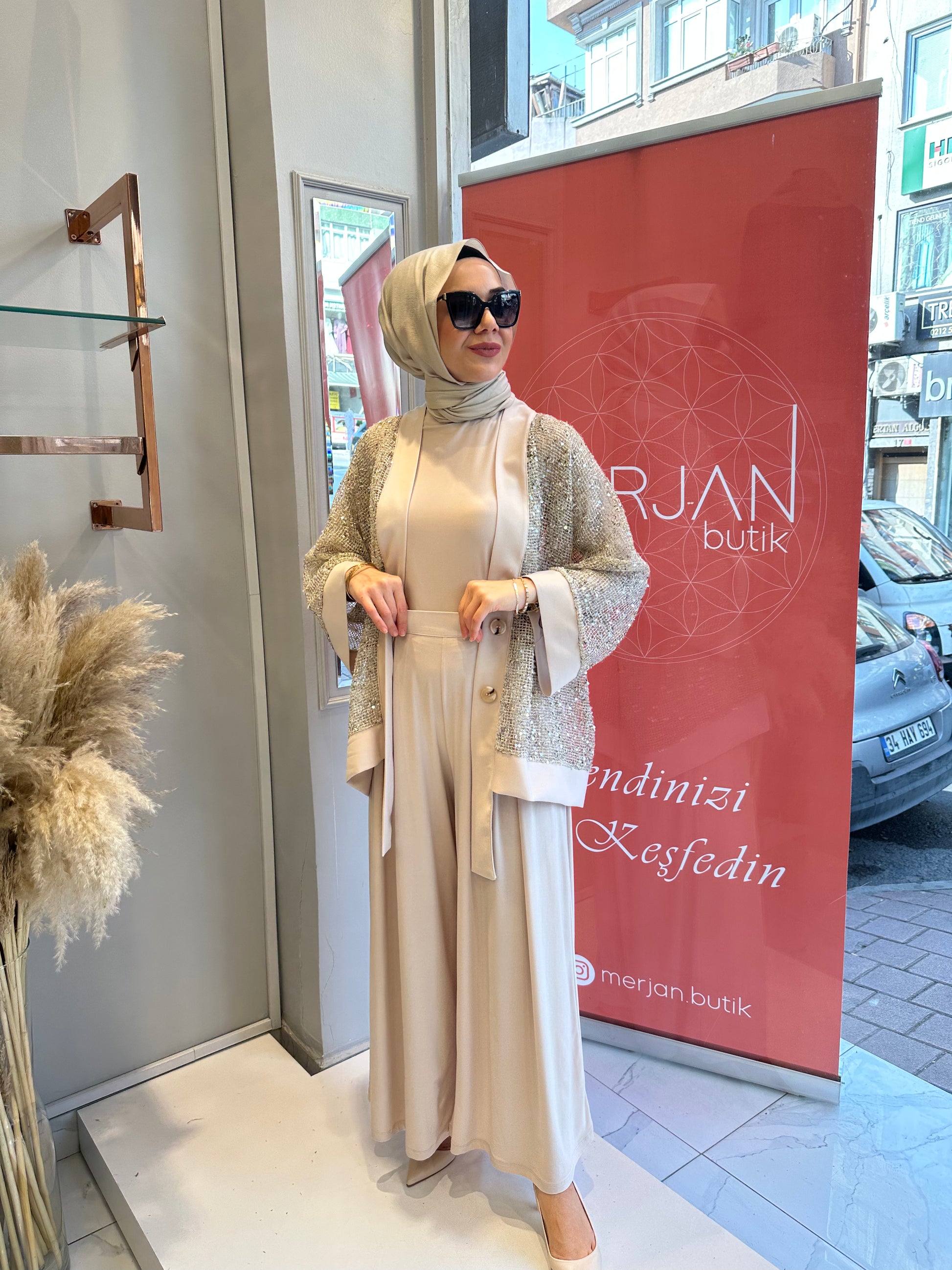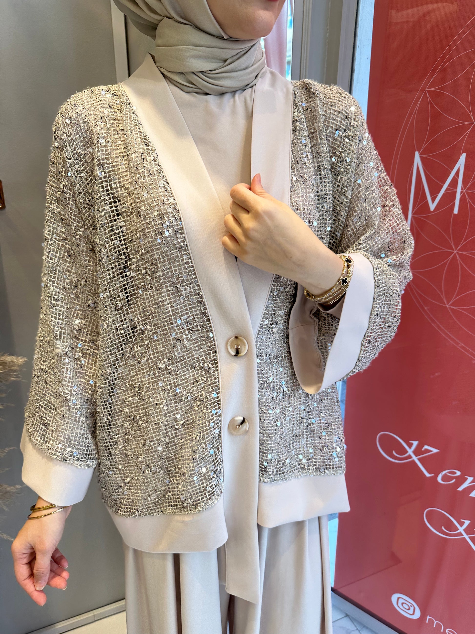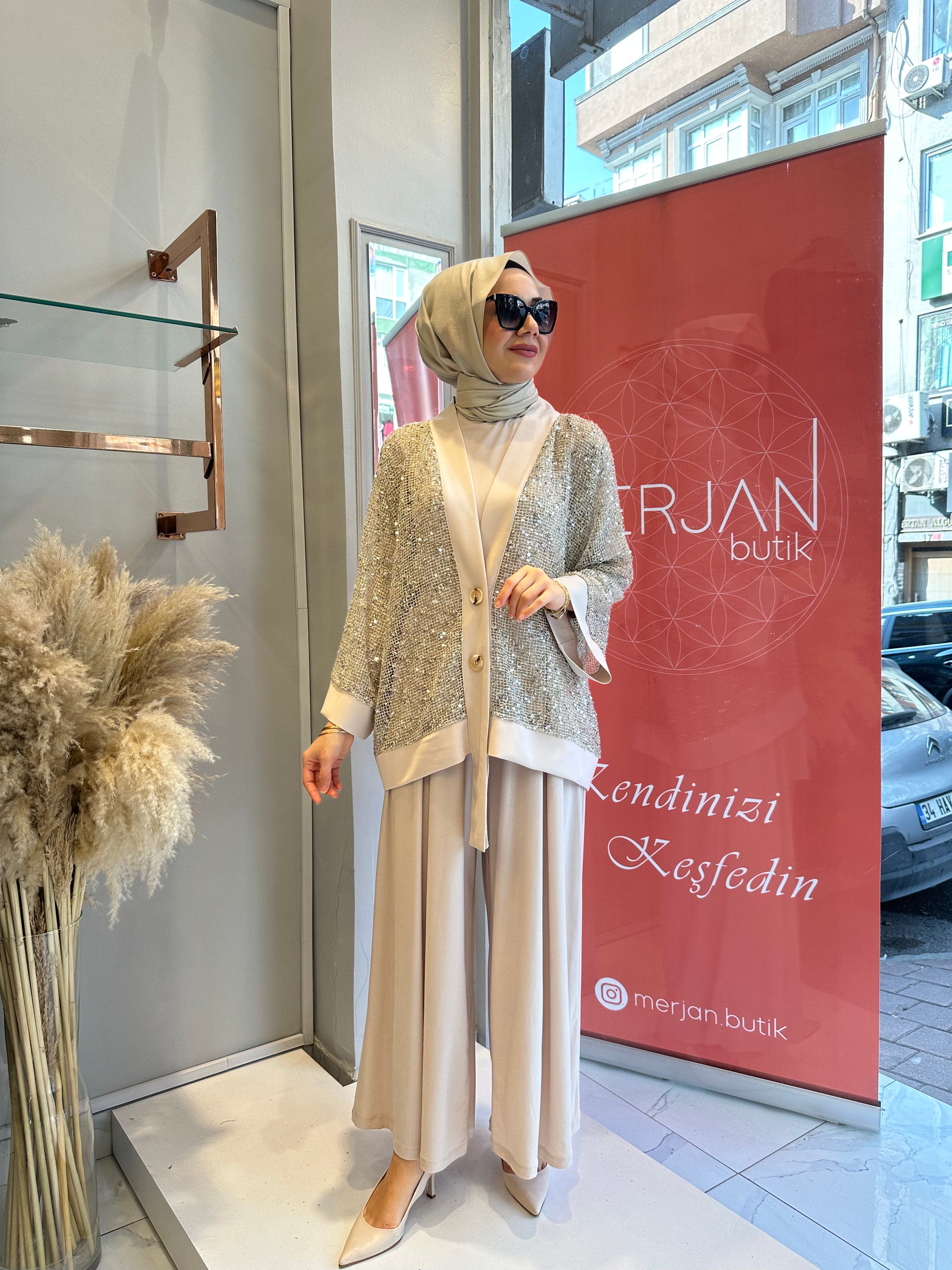 * Kumaş: Işıltılı payet detaylı şık kumaş (üst), dökümlü ve akıcı kumaş (pantolon)